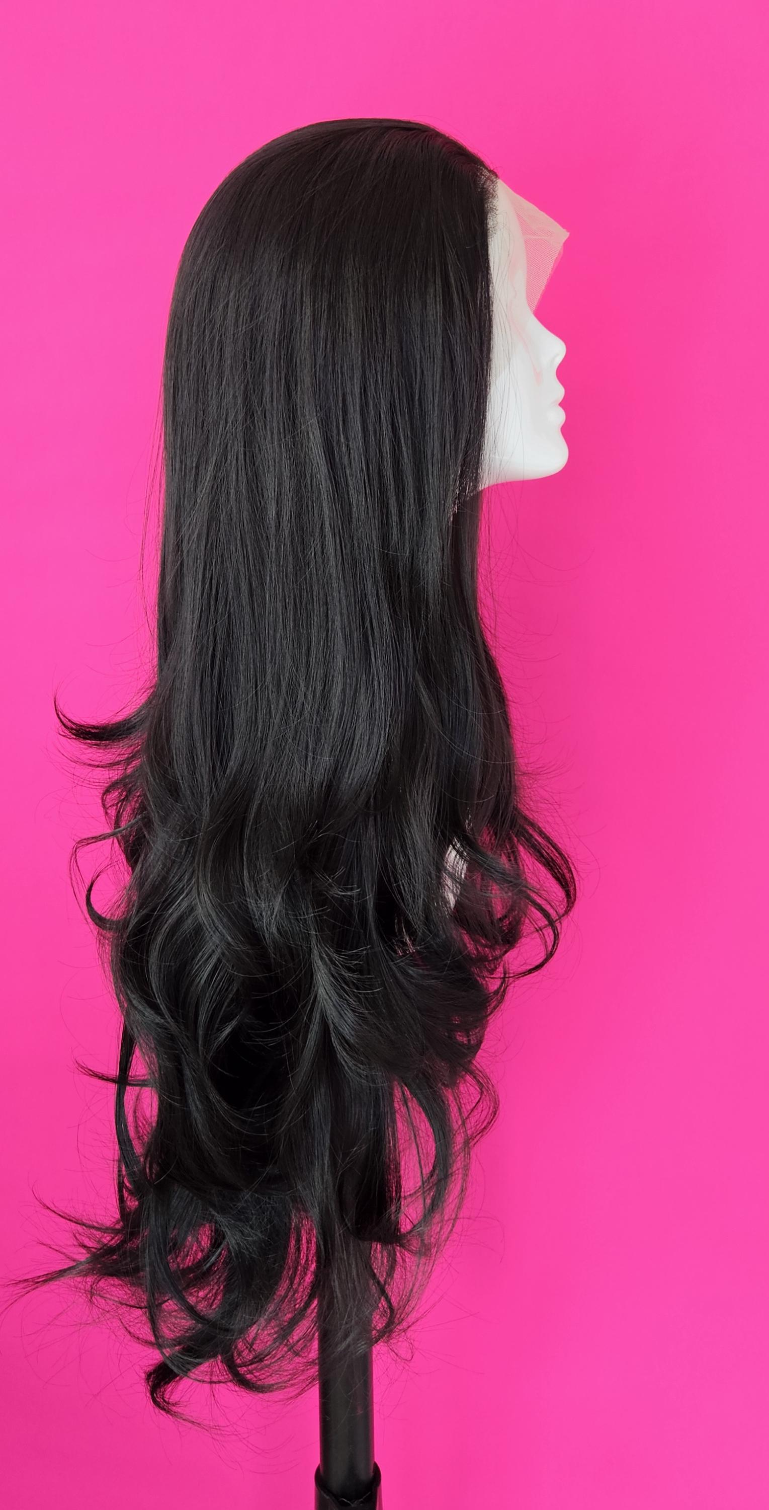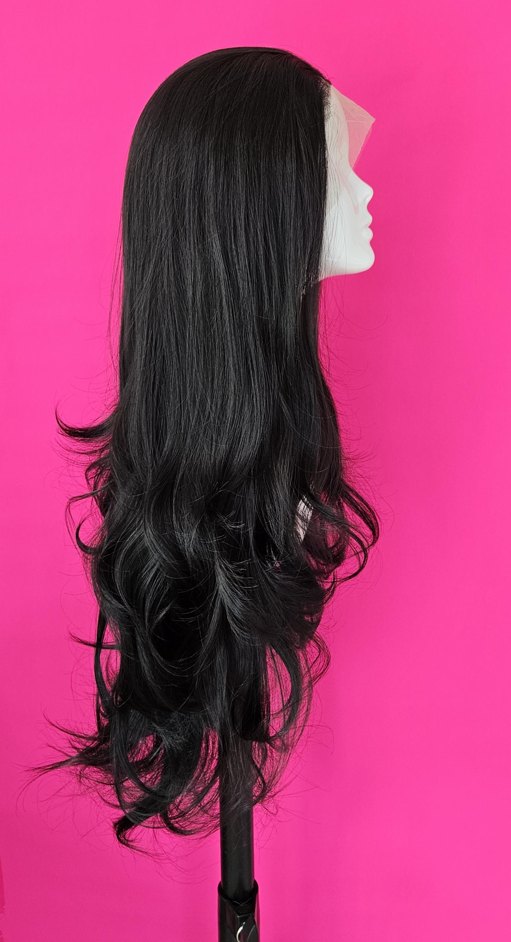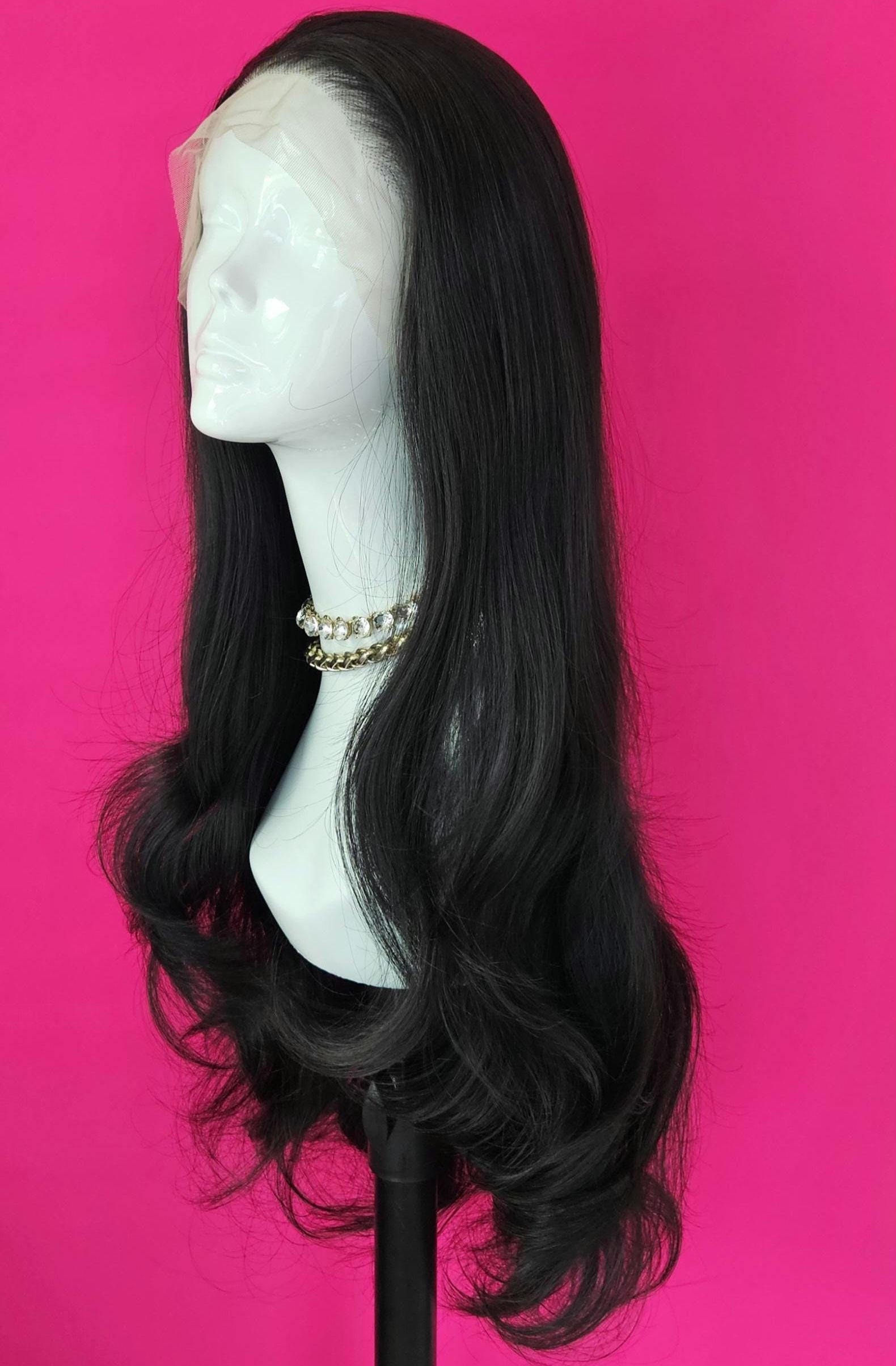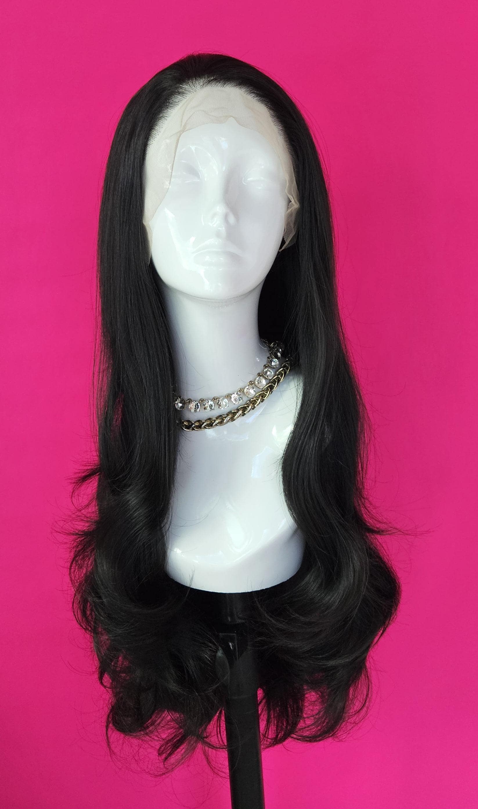 She is 26 inches long, styled on a 13x3 hand-tied lace front wig and made from synthetic fibers.