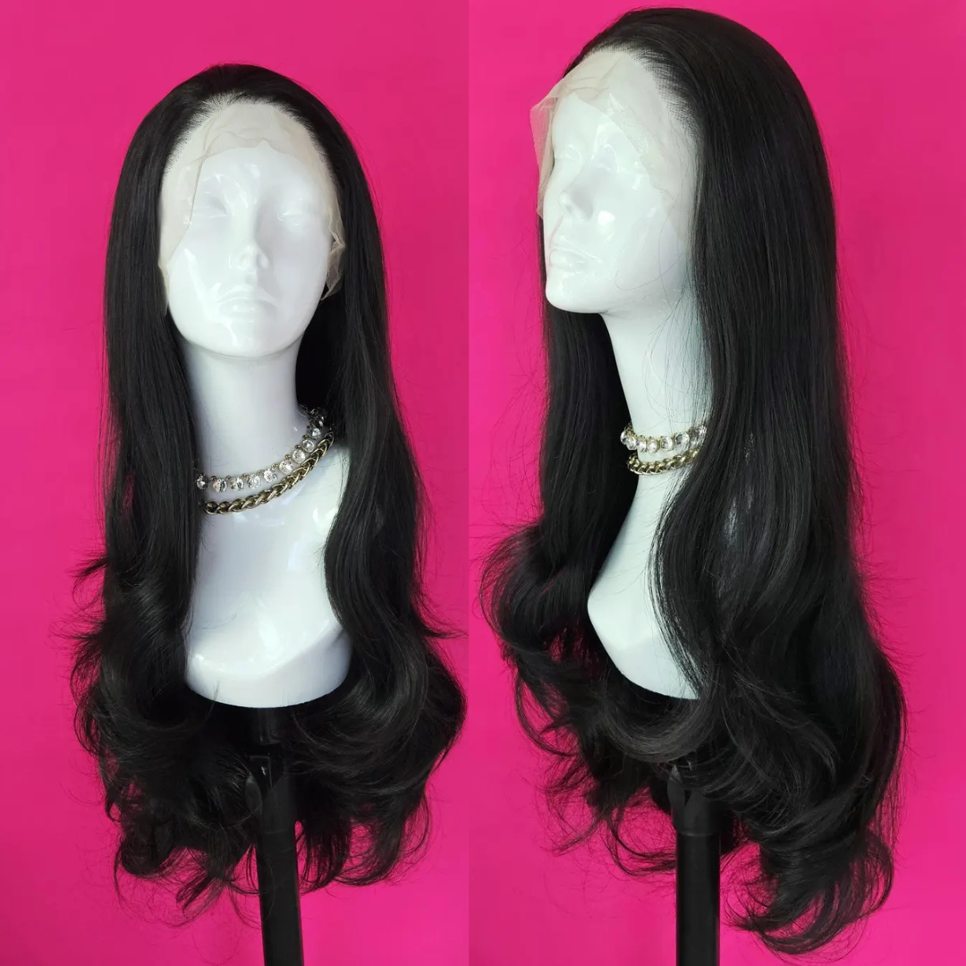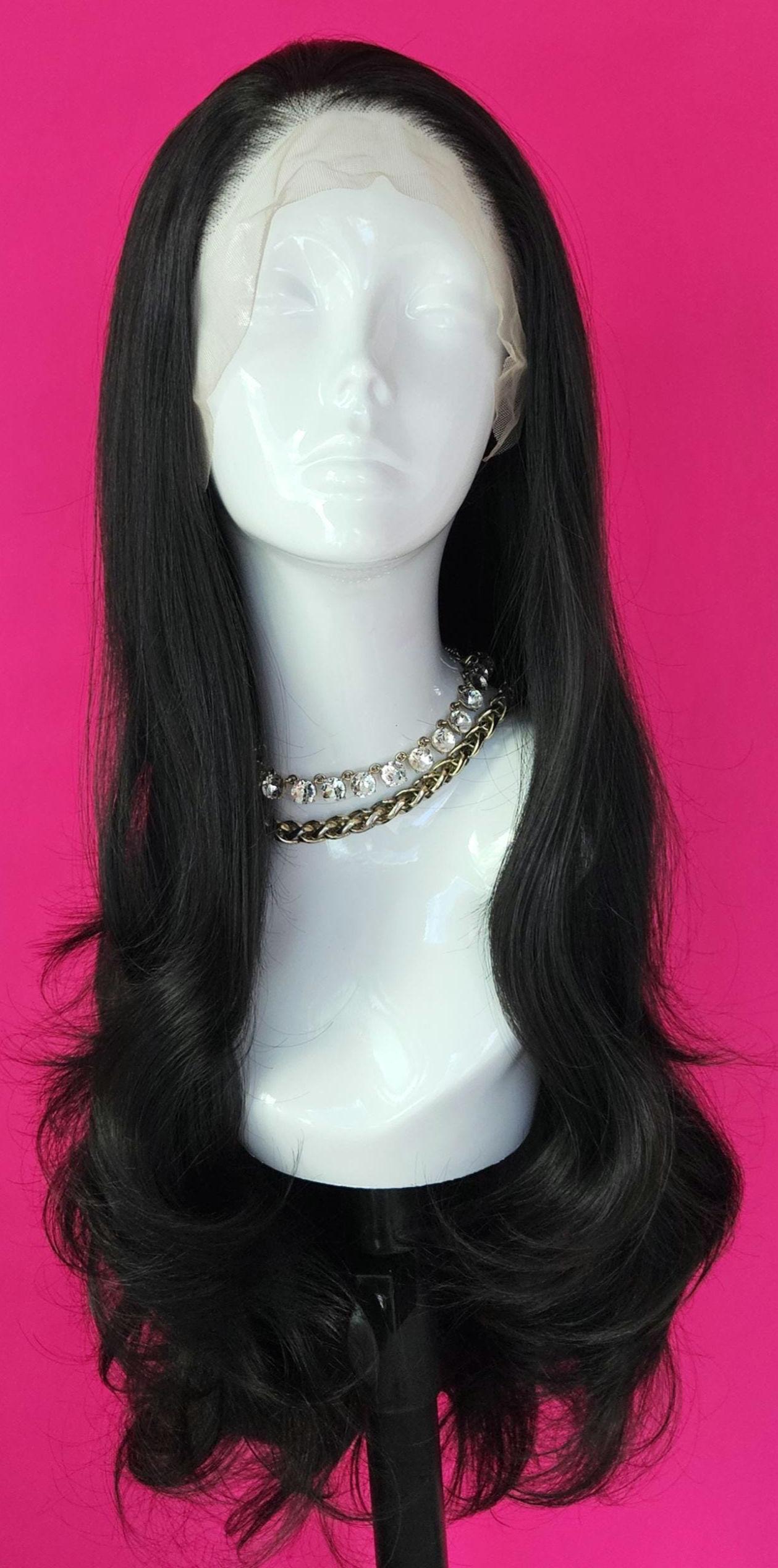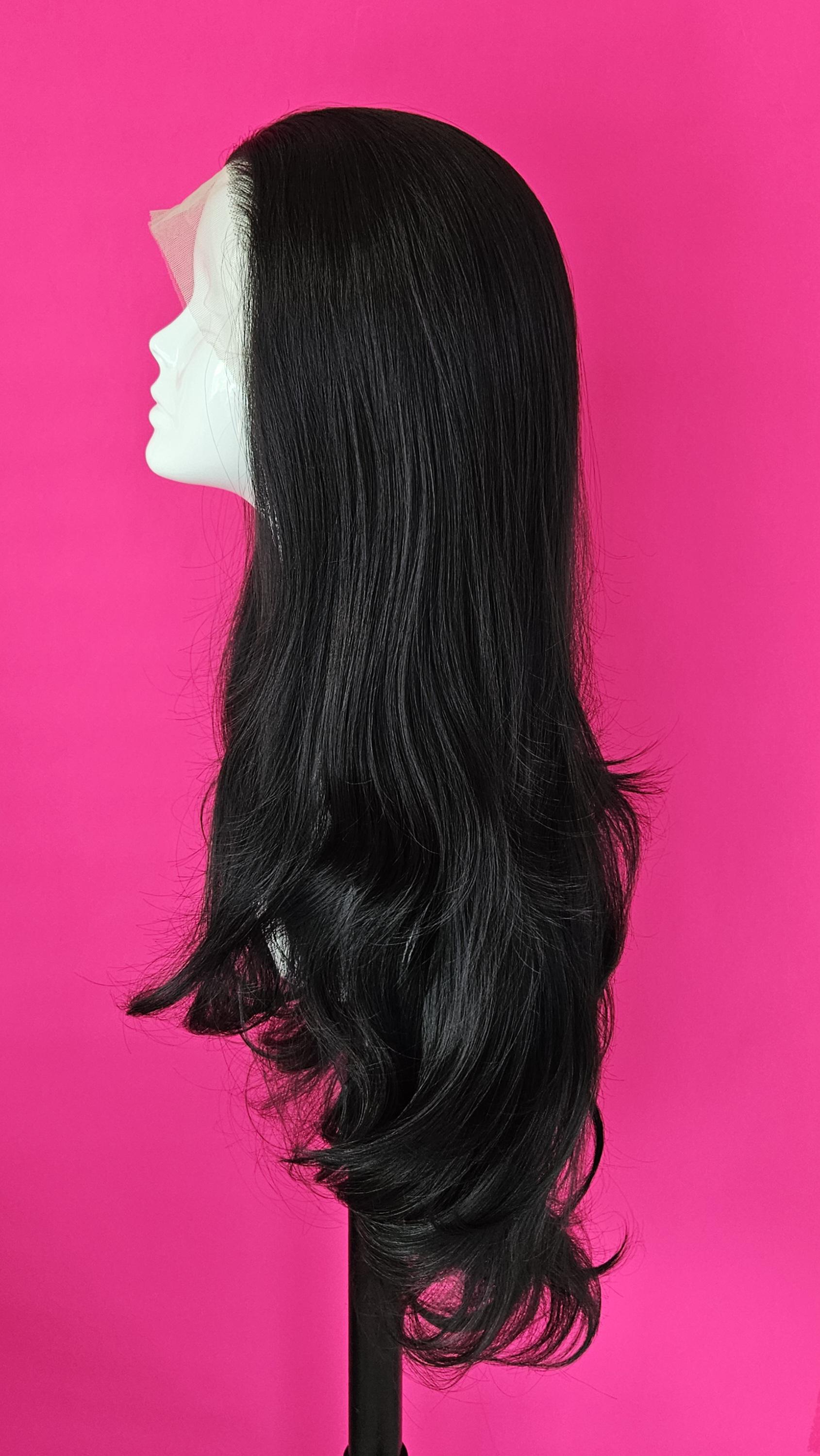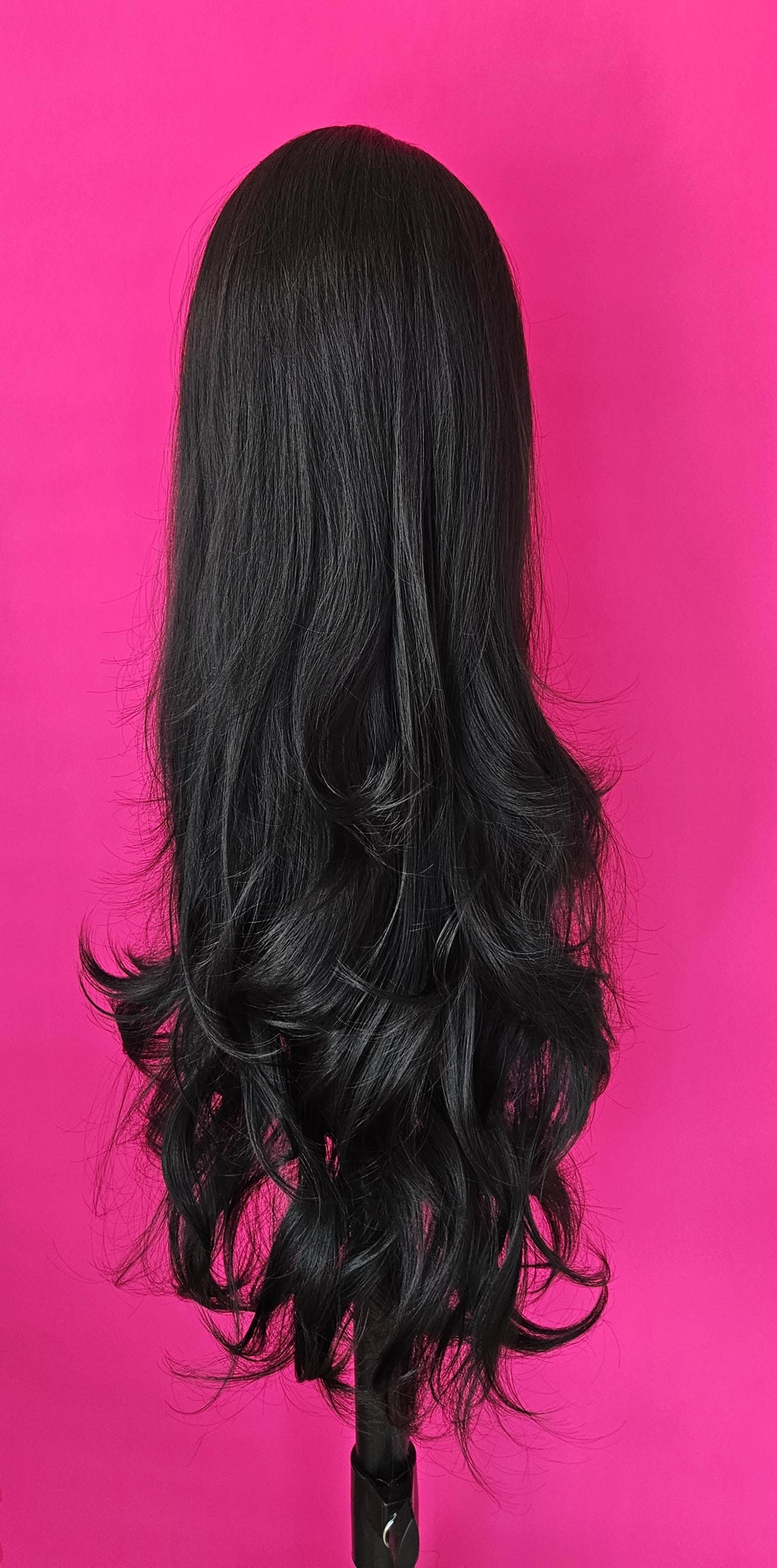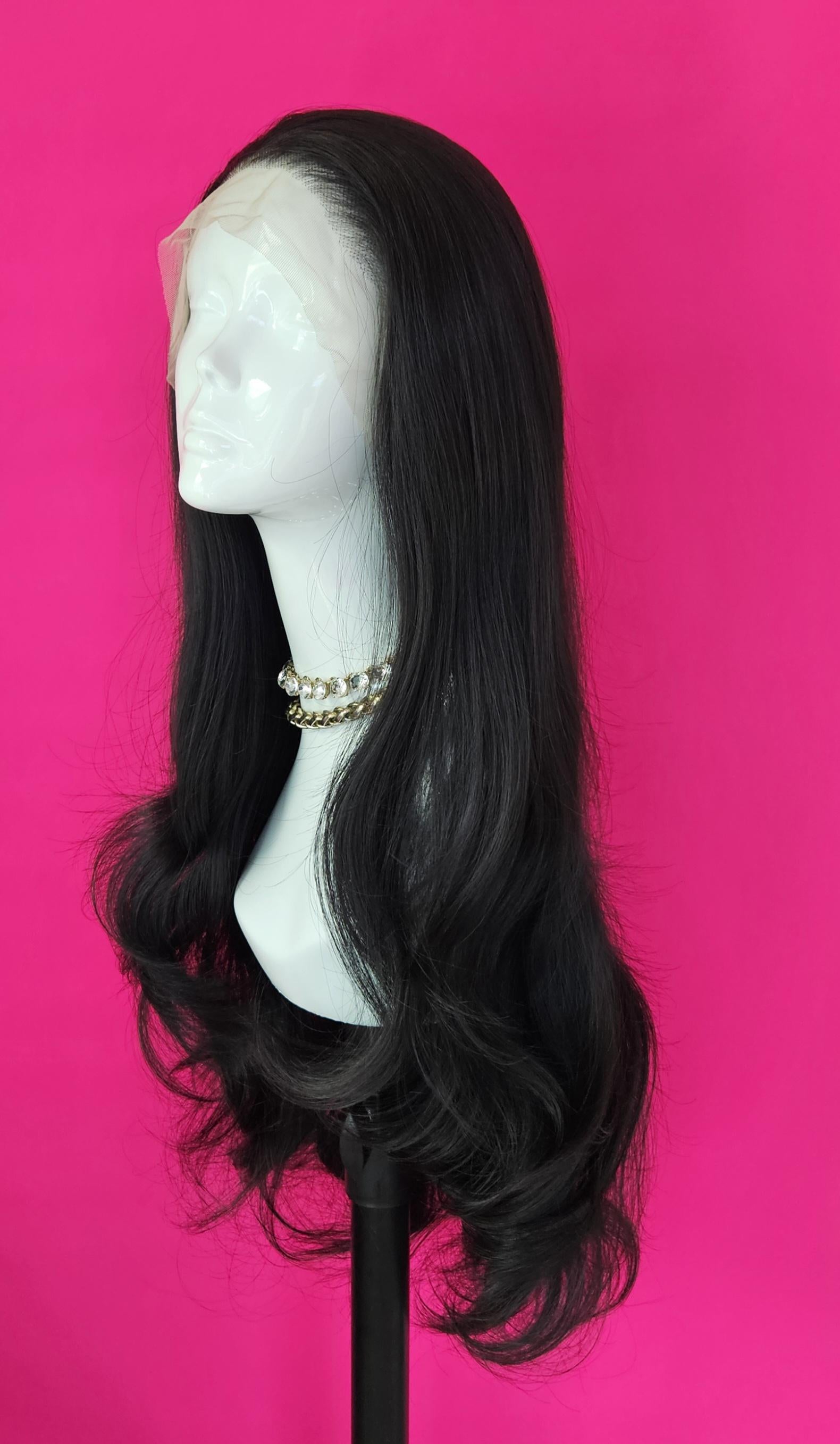 She is 26 inches long, styled on a 13x3 hand-tied lace front wig and made from synthetic fibers.