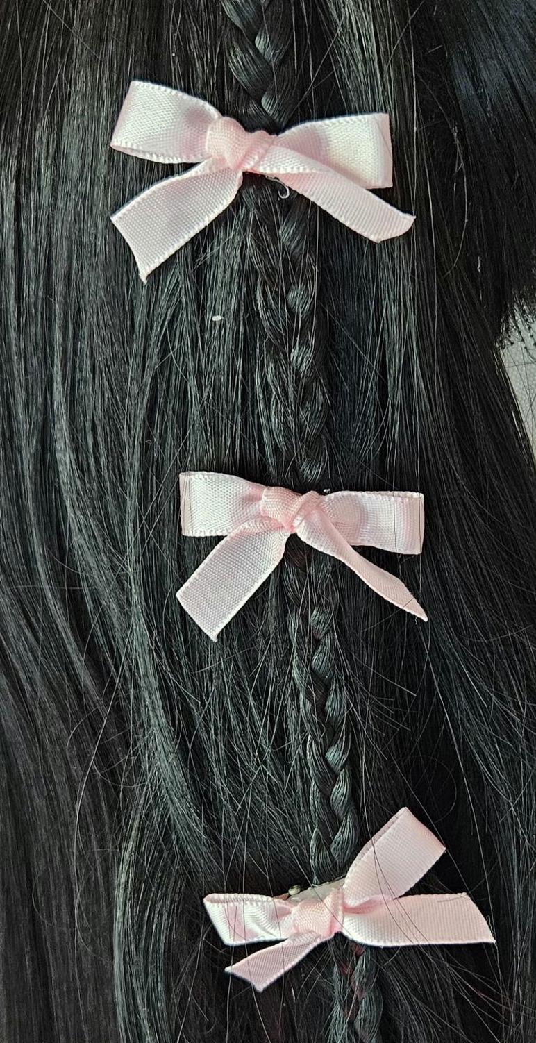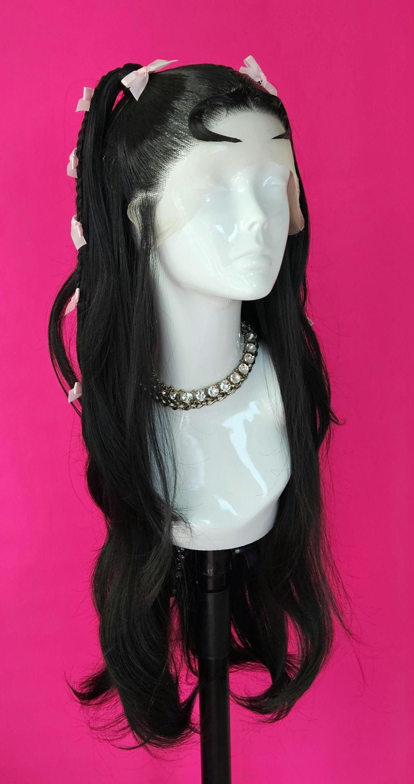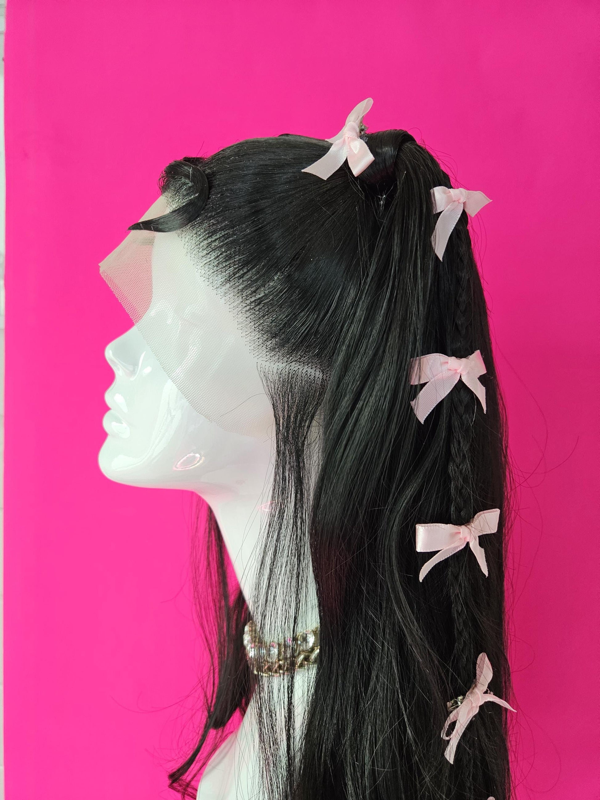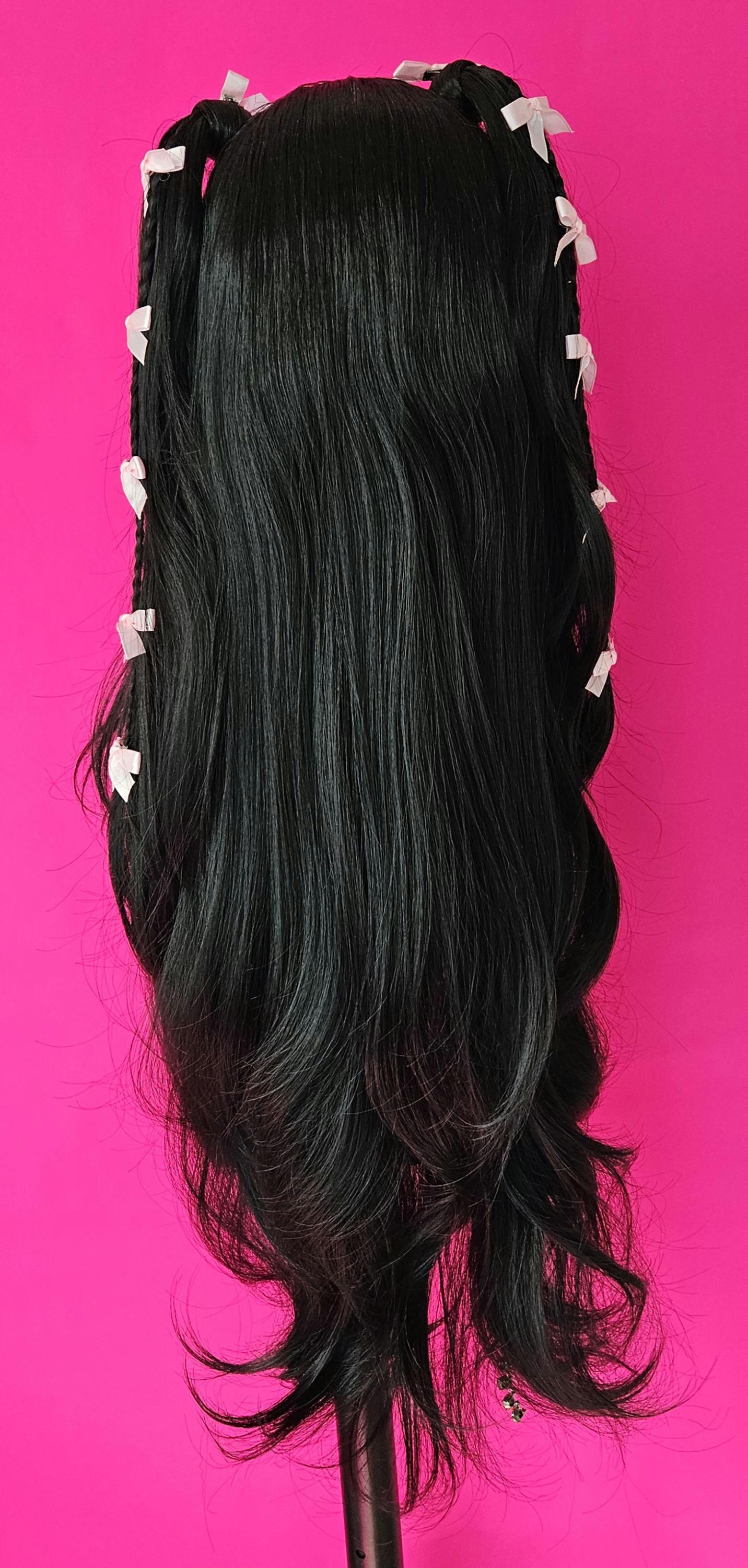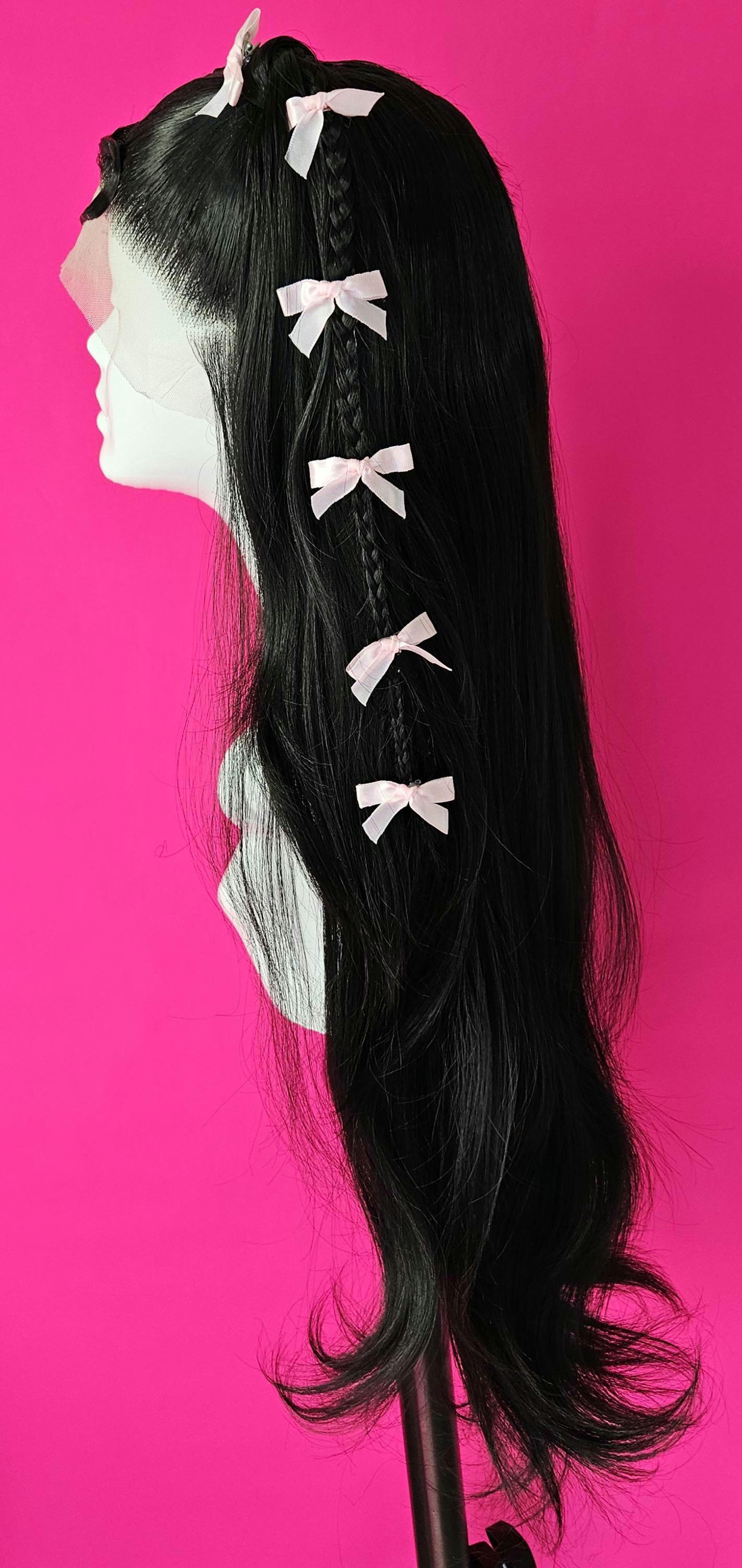 This beauty is styled on a 23-inch canvas wig head using a 13x3 hand-tied lace front wig, crafted from quality synthetic fibers. Finished with delicate pink bows